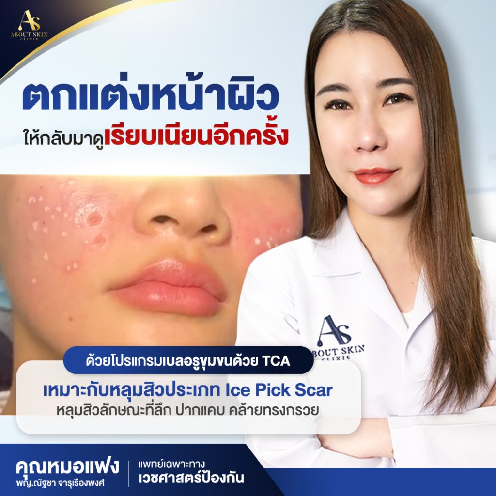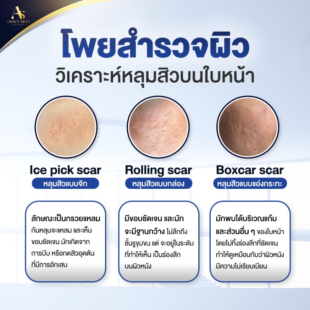 - Ice-pick scars: หลุมลึกและแคบคล้ายกรวย