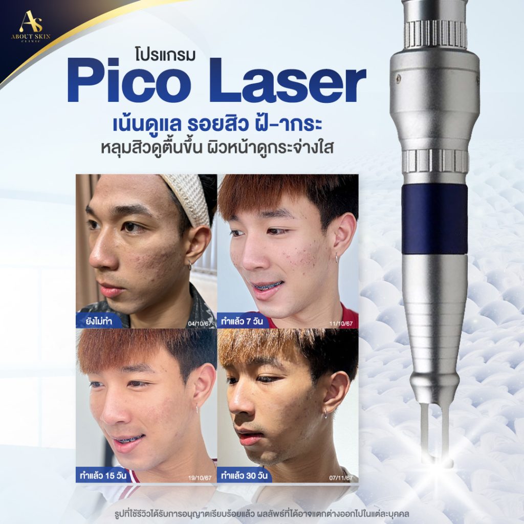 โปรแกรม Pico Laser เป็นการใช้พลังงานเลเซอร์ที่มีความเร็วสูงและสามารถเข้าสู่ชั้นผิวได้ลึกค่ะ โดยจะไม่ทำให้ผิวหน้าบาง เลเซอร์ชนิดนี้ช่วยกระตุ้นการสร้างคอลลาเจนและช่วยให้ผิวเรียบเนียนขึ้น ช่วยให้หลุมสิวตื้นขึ้นและลดความหมองคล้ำของผิวได้ด้วยค่ะ การรักษาด้วยโปรแกรม Pico Laser มักจะไม่ต้องพักฟื้นนานและเห็นผลได้ค่อนข้างเร็ว นอกจากนี้ยังสามารถรักษารอยสิวที่เกิดขึ้นหลังจากสิวหายได้ด้วย