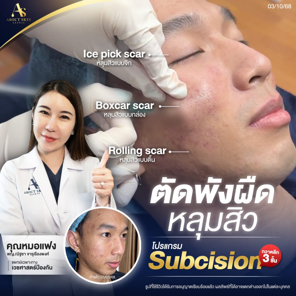 โปรแกรม Subcision เป็นการรักษาหลุมสิวที่มีความลึกโดยการตัดพังผืดที่อยู่ใต้ผิวหนังค่ะ ผังผืดมักเป็นสาเหตุที่ทำให้หลุมสิวไม่สามารถตื้นขึ้นได้ เทคนิคนี้จะช่วยกระตุ้นการสร้างคอลลาเจนใหม่ และทำให้หลุมสิวค่อย ๆ ตื้นขึ้นในระยะเวลาที่ไม่ยาวนาน การรักษานี้เหมาะสำหรับผู้ที่มีหลุมสิวลึกและต้องการผลลัพธ์ที่ถาวรมากขึ้นค่ะ คนที่เป็นหลุมสิวลึกและเป็นมานาน แนะนำวิธีนี้เลยค่ะ