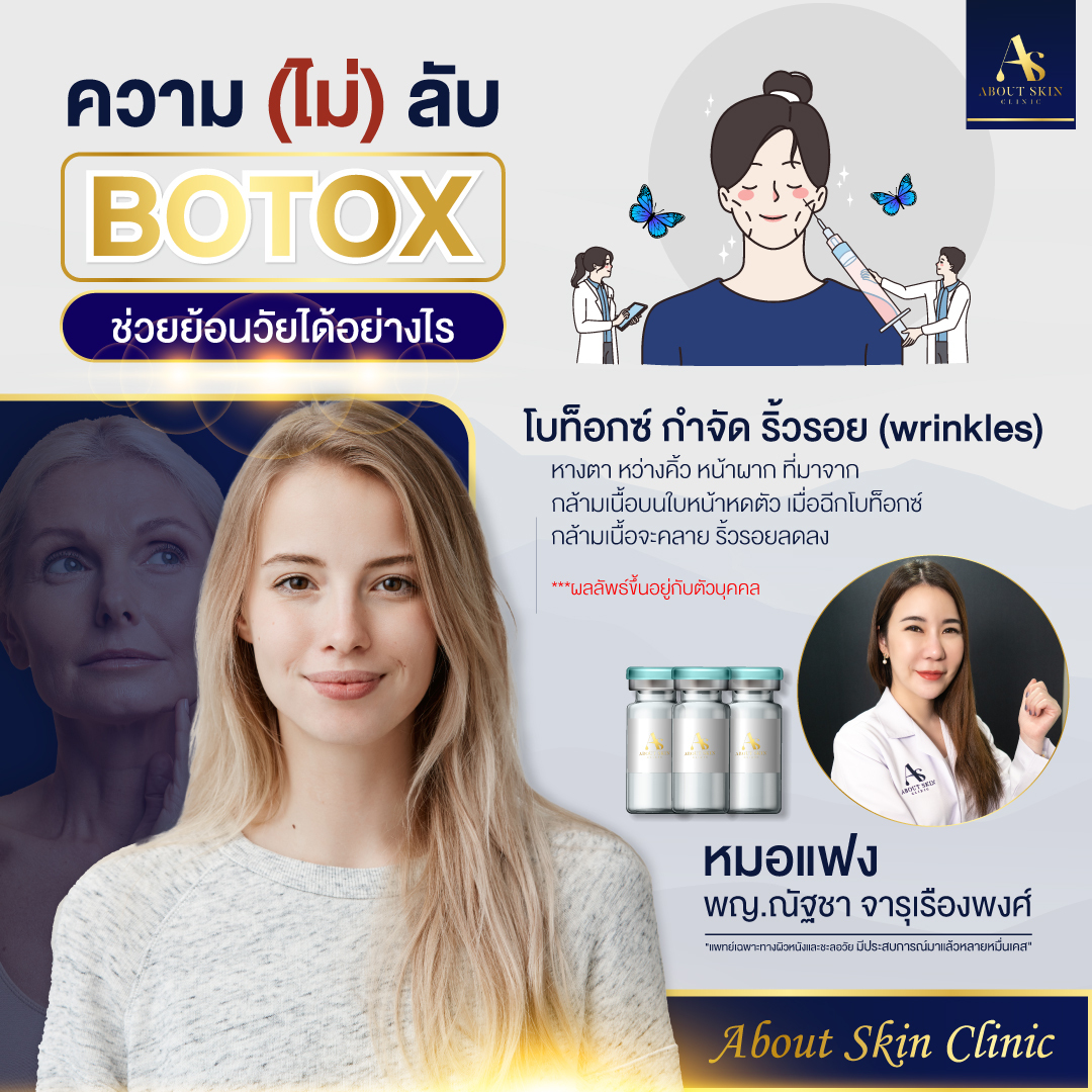 ABOUTSKIN คลินิกเสริมความงาม พร้อมอยู่เคียงข้างคุณในทุกช่วงวัยของความงาม ด้วยผลิตภัณฑ์โบท็อกซ์ที่ผ่านการรับรองมาตรฐาน ช่วยให้ใบหน้าของคุณดูเรียวกระชับ ผิวเรียบเนียน